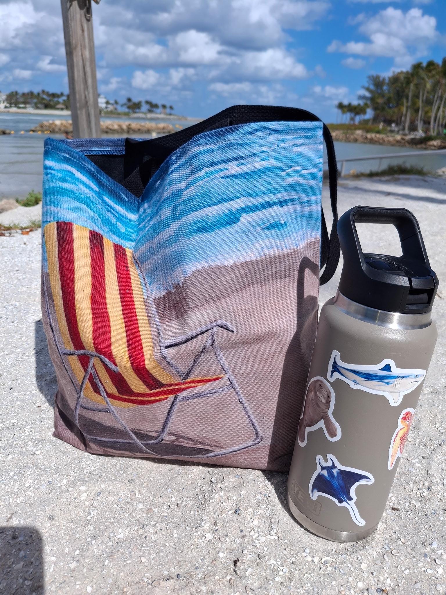 This tote bag features a print of an acrylic beach painting I created in 2020. Our family spends a lot of time on the water, the painting was based on a photo I took while in Coco Beach, Florida.